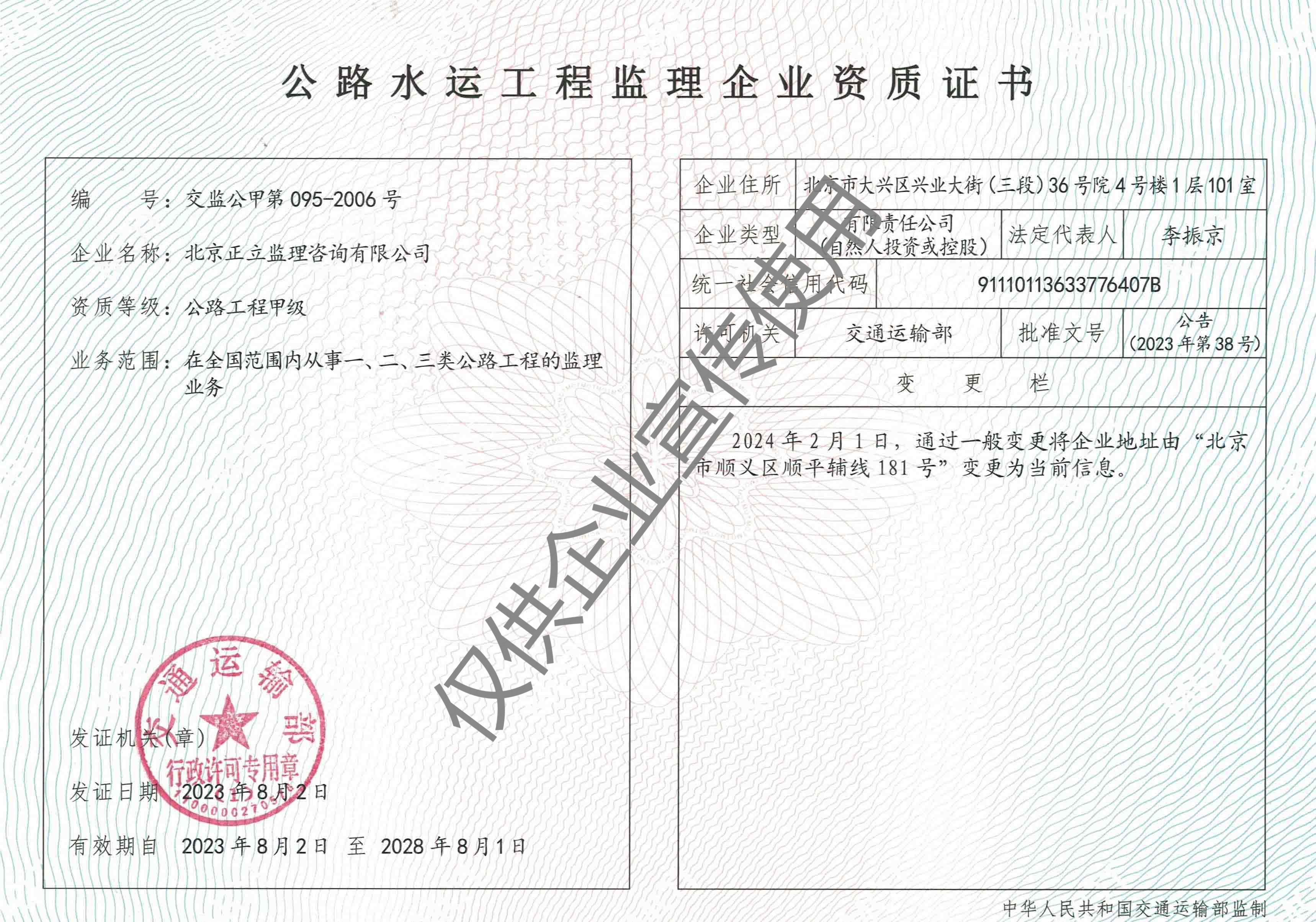 公司現為中國交通建設監理協會理事單位,持有交通運輸部公路工程甲級資質、房屋建筑工程乙級資質、市政公用工程乙級資質、綜合檢測乙級資質。能夠承擔高等級公路、大型橋梁、隧道工程、房建市政的施工監理及技術咨詢服務。